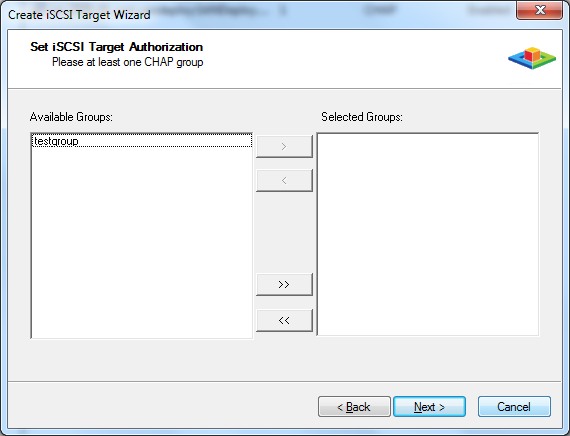 When you want to use CHAP, select some groups from Available Groups box, and then click > button to add them to Selected Administrator's Groups.